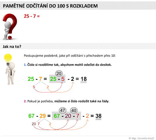 Odčítat můžeme zpaměti či písemně, stejně jako u sčítání, i zde si můžeme při pamětném odčítání čísla rozložit: